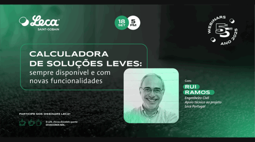 No próximo webinar webinar Leca® 5as às 5 vai se apresentada a a Calculadora de betões leves Leca®. É uma ferramenta gratuita de apoio à formulação de betões leves evoluiu e transformou-se na Calculadora de soluções leves. Agora mais completa, versátil e pensada para simplificar os seus cálculos. Além de permitir calcular betões e argamassas, pode também explorar soluções especiais e…