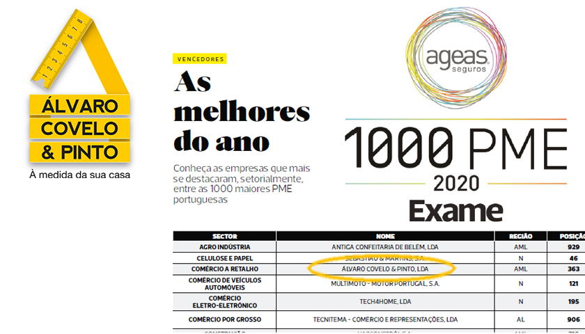 A empresa Álvaro Covelo Pinto, associado da Associação Materiais de Construção foi considerada, pela Revista EXAME, a melhor empresa do setor do comércio a retalho, entre as 1000 maiores PME.