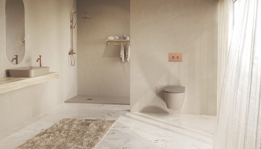 O castanho quente e sofisticado, que evoca conforto, elegância e uma ligação genuína à natureza, inspira novos acabamentos que traduzem esta paleta cromática, como a BLINK em bronze, a sanita LAKE e os lavatórios SUN em cappuccino.