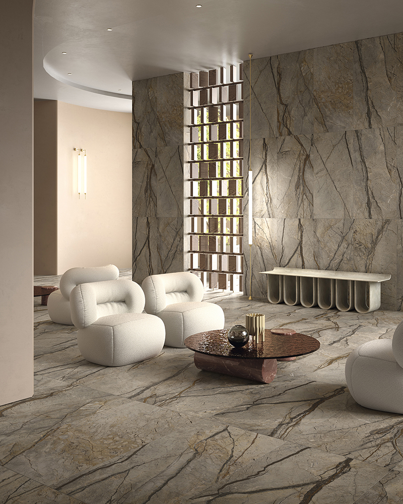 O resultado são revestimentos e pavimentos cerâmicos com um design muito natural e realista que reproduzem a sensação visual e material dos mármores e das madeiras nobres, reinterpretando-os com um olhar contemporâneo.