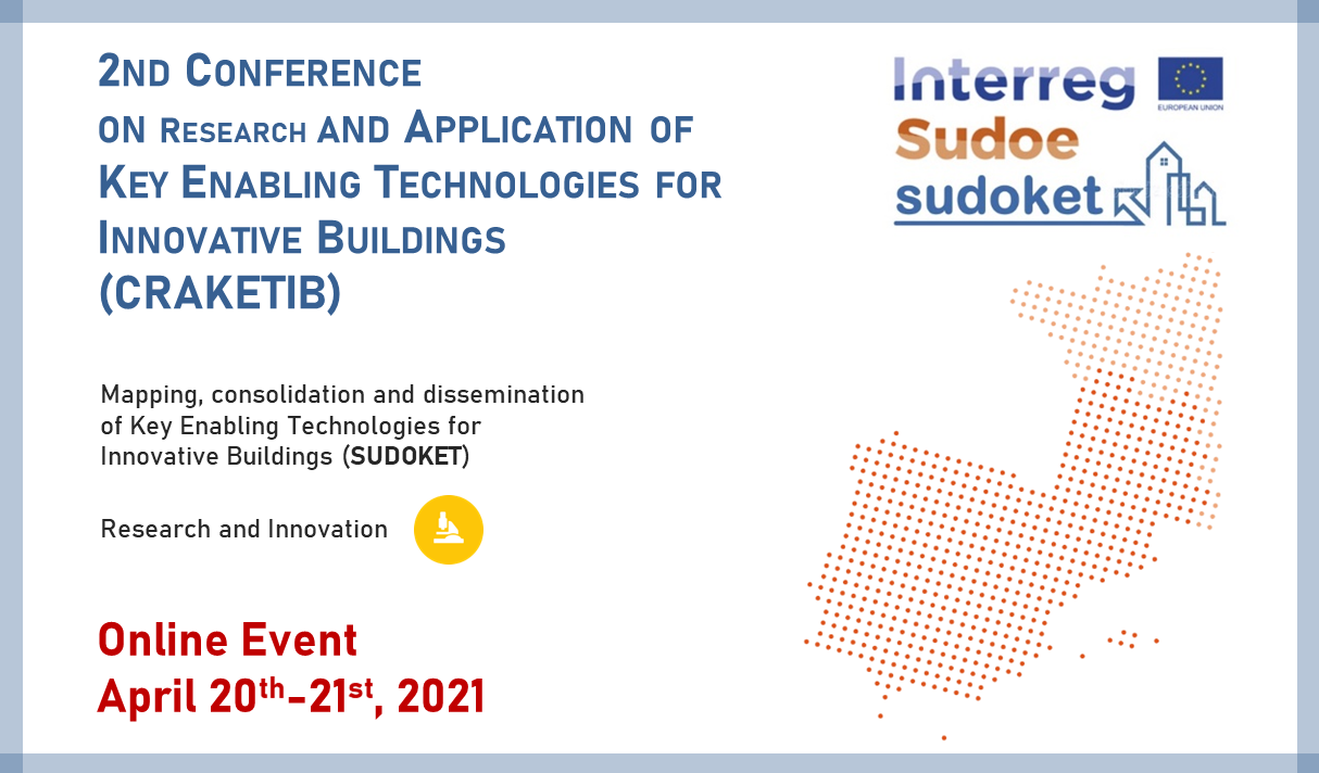 No âmbito do projeto SUDOKET irá realizar-se nos dias 20 e 21 de abril, via videoconferência, o 2nd CRAKETIB (Conference on Research and Application of Key Enabling Technologies for Innovative Buildings).
