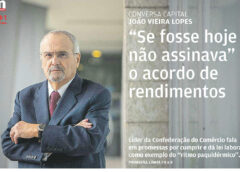 Entrevista Presidente da CCP Engº João Vieira Lopes ao jornal Negócios ”Um acordo como este não voltava a assinar” Deu o benefício da dúvida, mas garante que se fosse hoje não assinava o acordo de rendimentos com o Governo. Presidente da CCP fala em promessas por cumprir e dá o exemplo do “ritmo paquidérmico” dos trabalhos para revisitar a legislação…