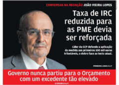 entrevista de João Vieira Lopes, CCP ao Jornal de Negócios “NAO ASSINAREMOS NENHUM ACORDO SEM ‘MIX’ [QUE INCLUA MEXIDAS NO IRC E NAS TRIBUTAÇÕES AUTÓNOMAS]” O lider da Confederaçãoo do Comercio e Serviços de Portugal (CCP) concorda com a baixa do IRC, mas defende mais: quer a taxa reduzida para as PME aplicada aos primeiros 100 mil euros tributaveis, o…